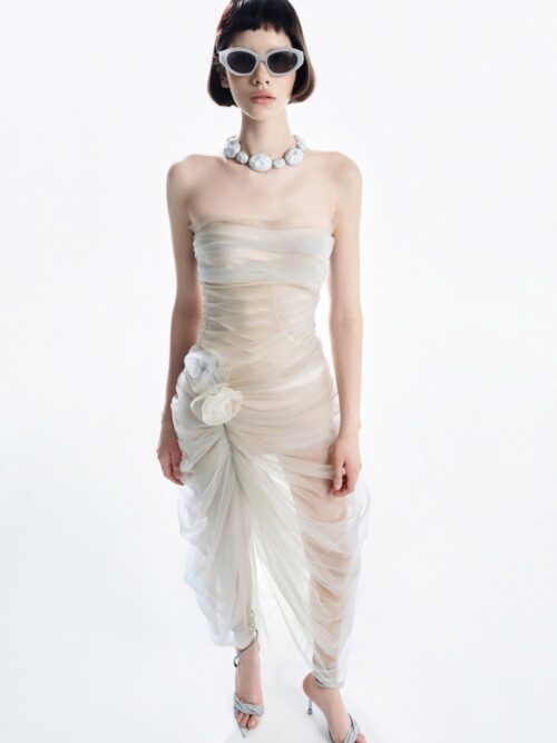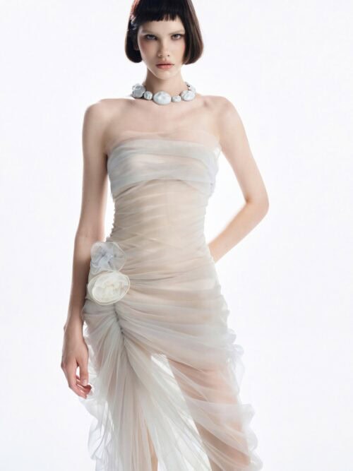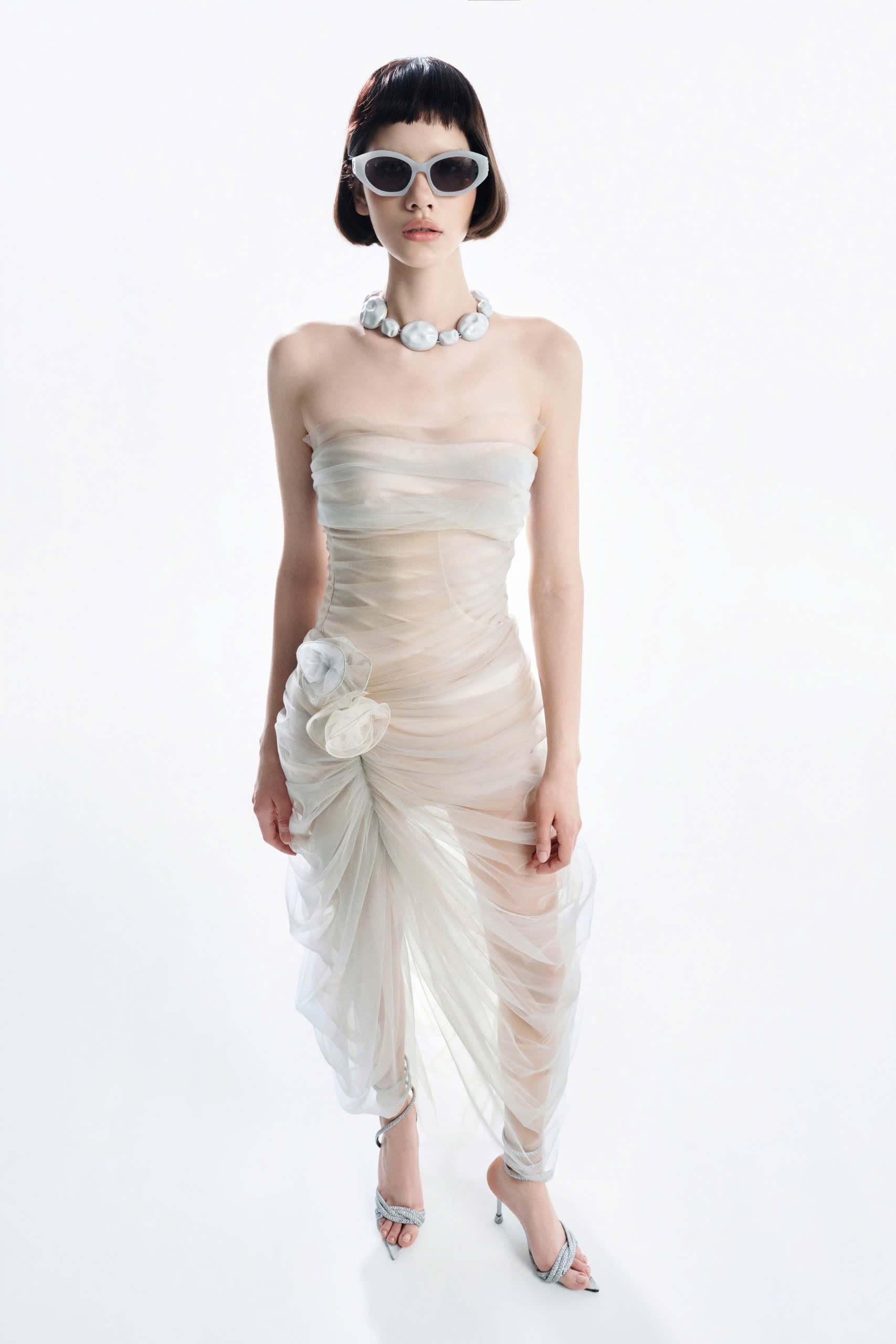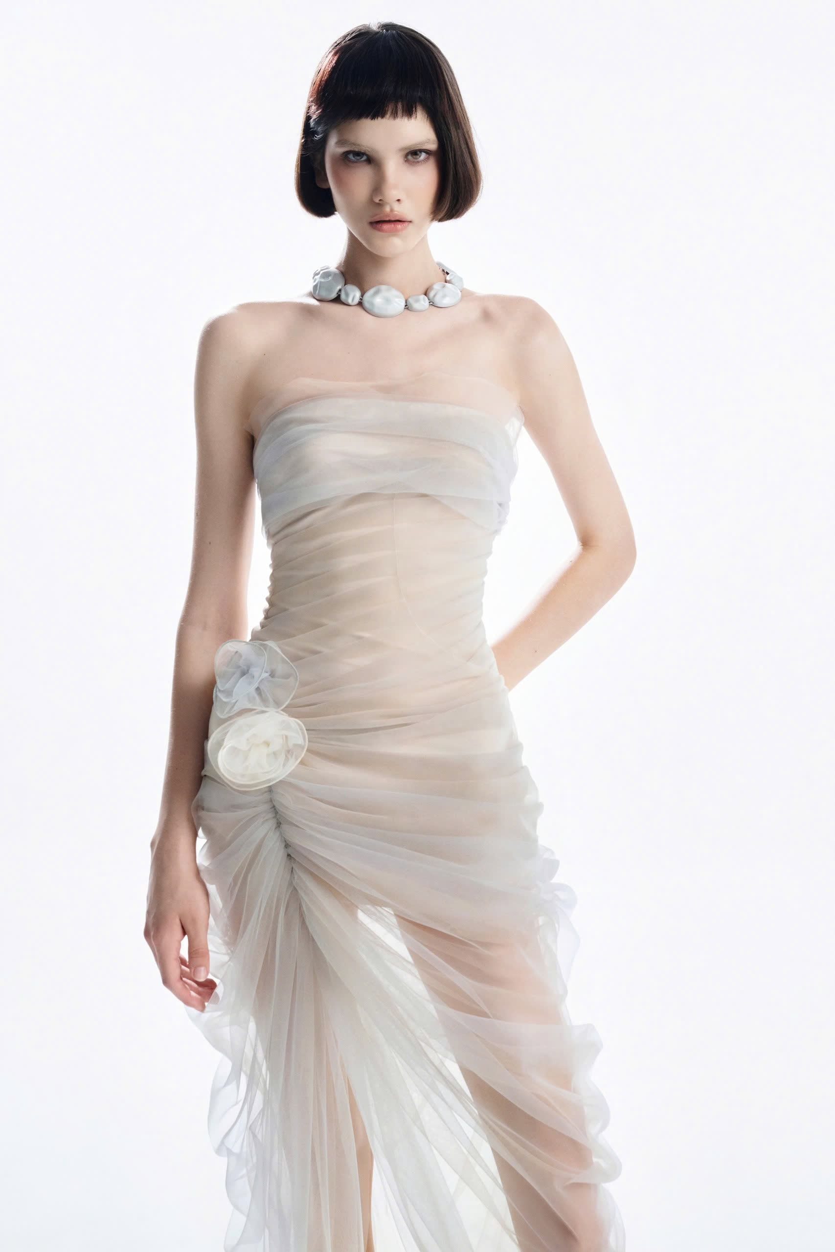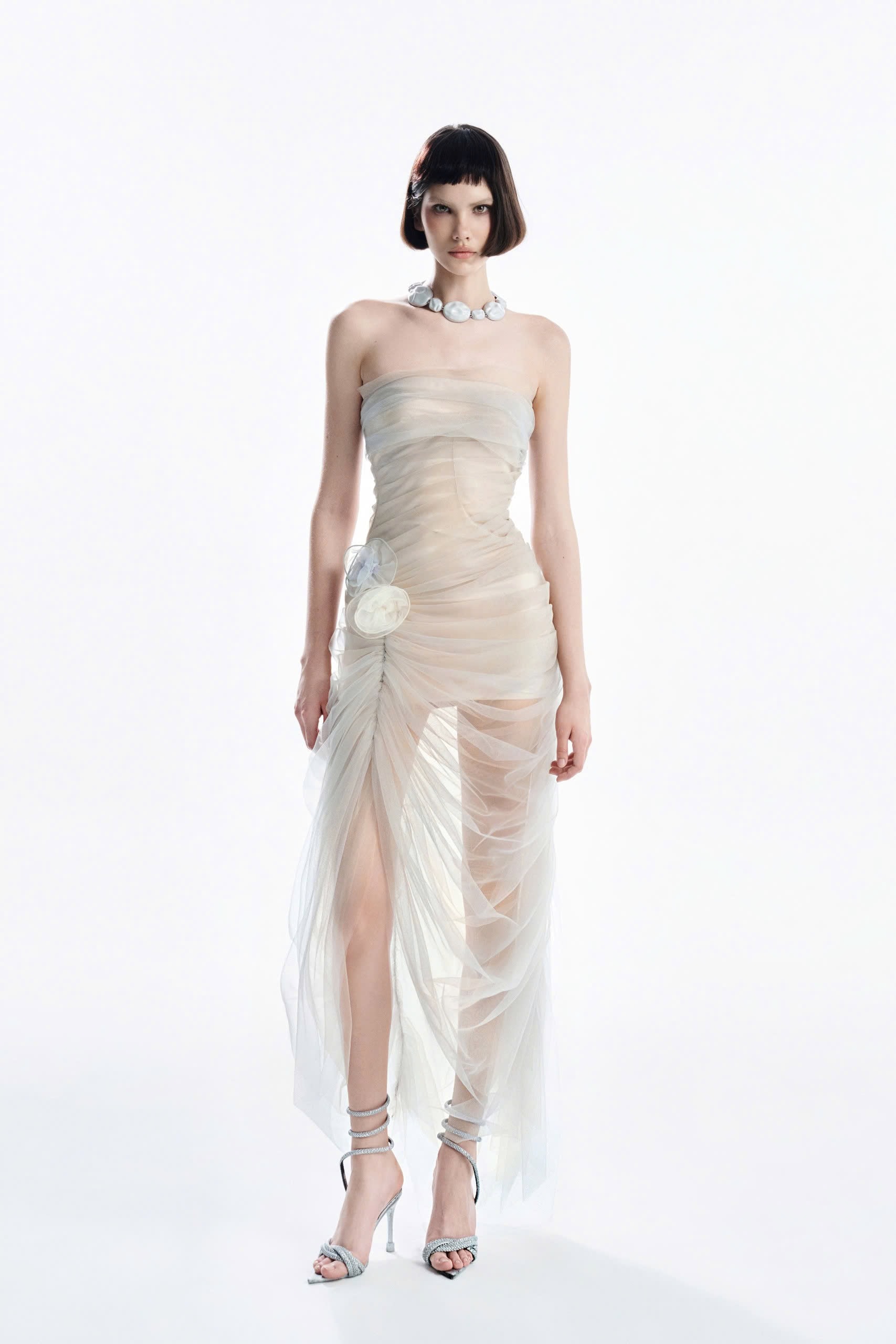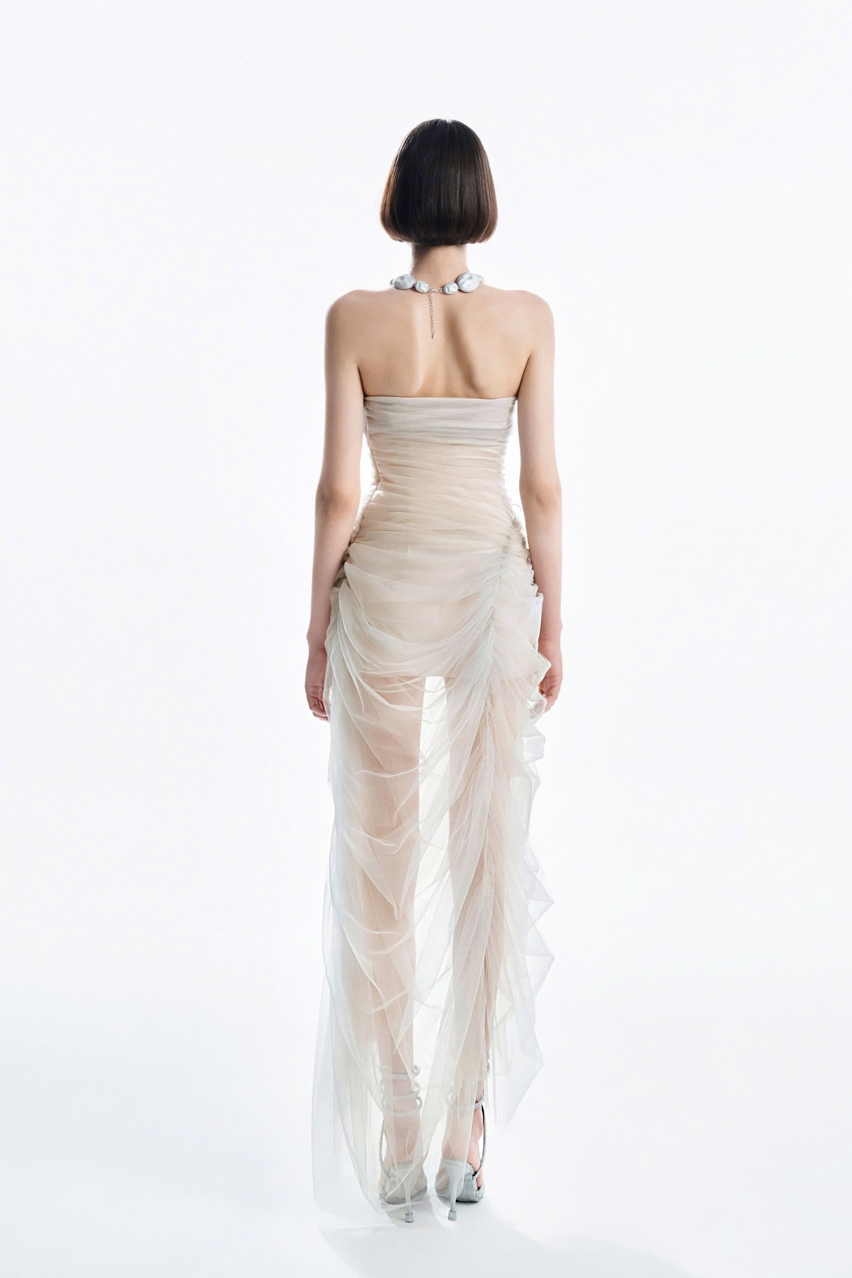 – Nude-toned corset-style bodice hugs the body