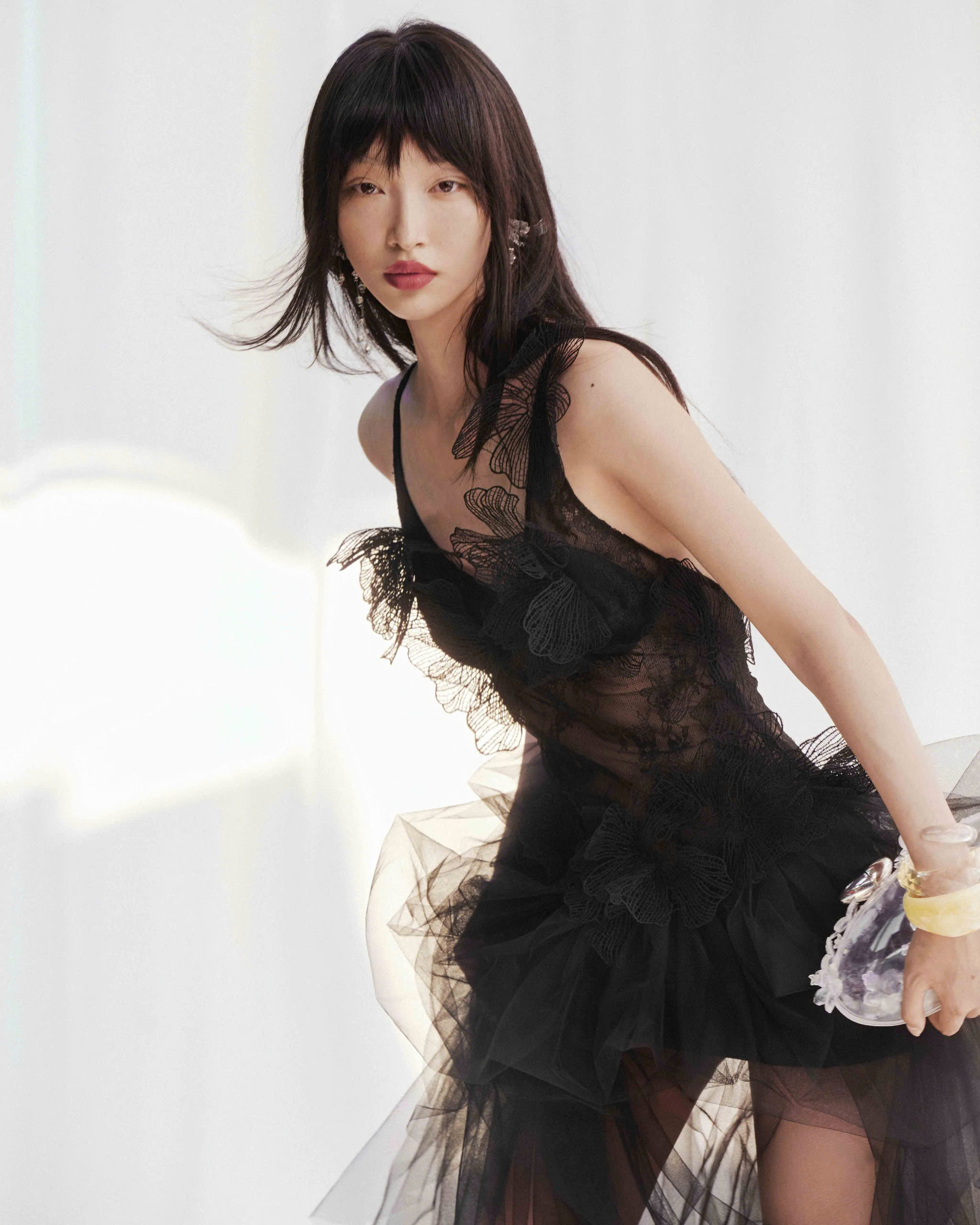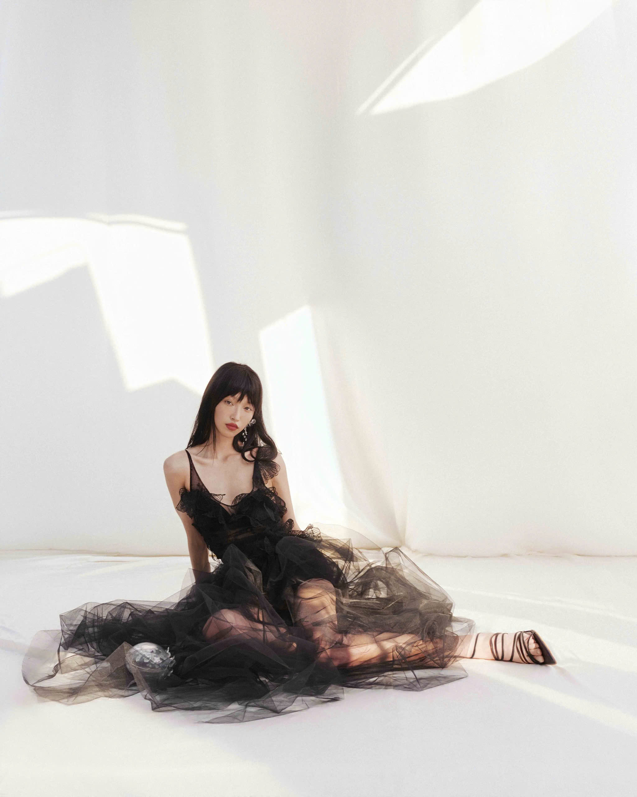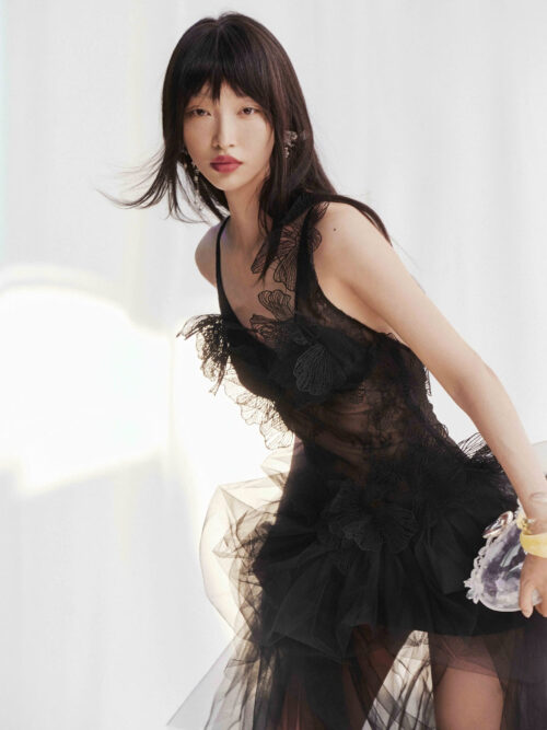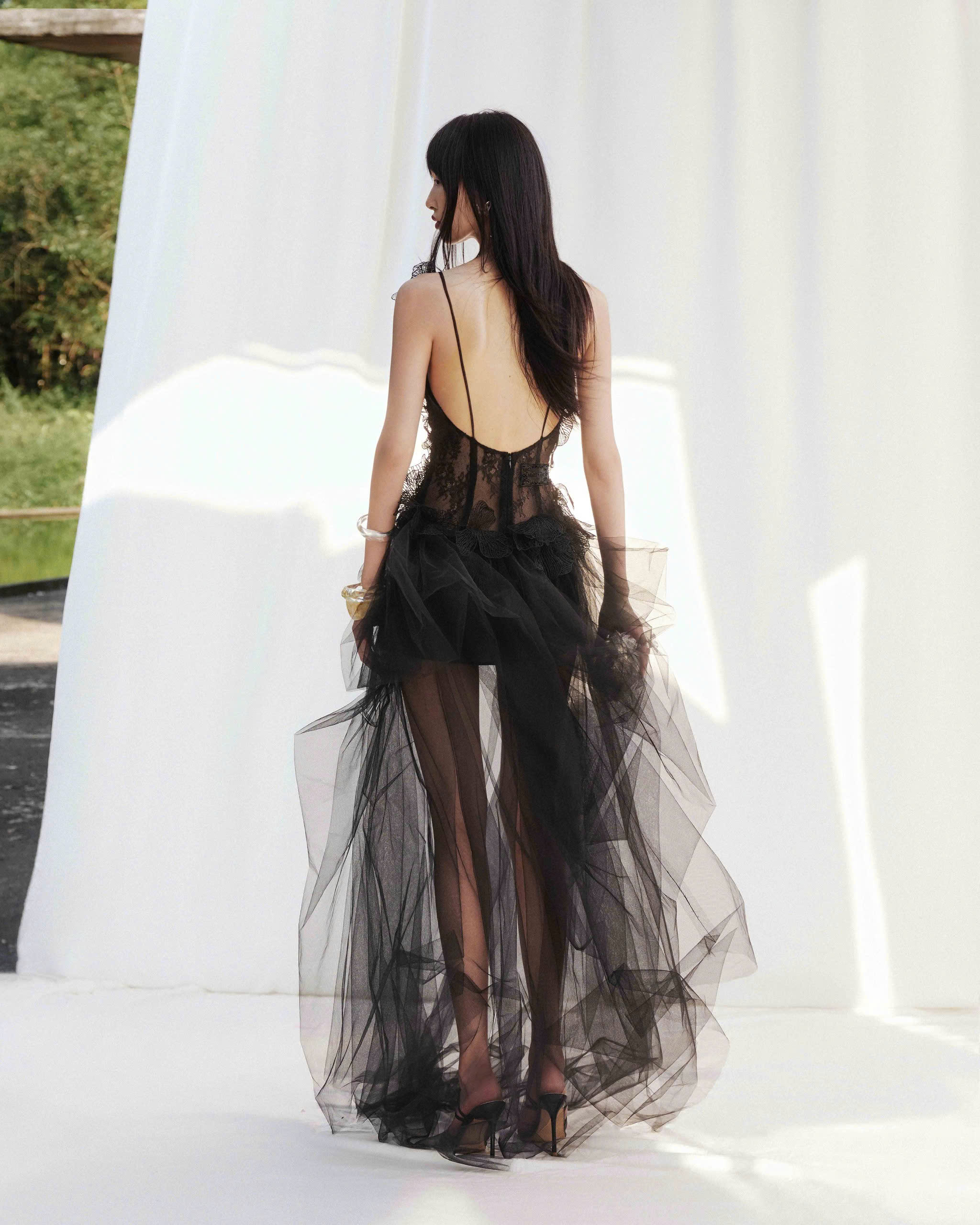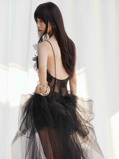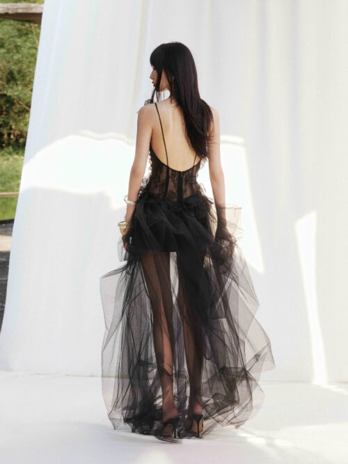 Strapless maxi dress 3D floral appliqués on the surface Asymmetrical layering of sheer fabric